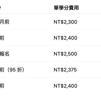 一個月前報名:每學分 NT$2,500