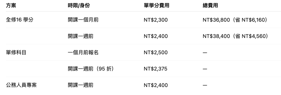 公務人員專案:一週前報名,全修或單科皆為每學分 NT$2,400